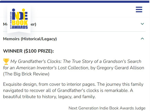I am excited to share that My Grandfather's Clocks, published by The Big Brick Review, is winner of a 2025 Indie Award!